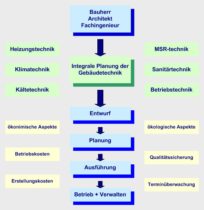 Integrationsplanung beschreibt den Gesamtprozess „Beratung - Planung - Ausschreibung - Bauüberwachung - Abnahme“ von Funktionen, die mehr als ein Gewerk betreffen.