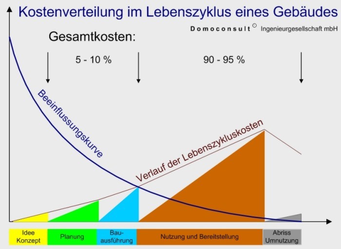 Vermeidet man schon in der Anfangsphase Fehler in der Konzeption und Planung eines Gebäudes, kann man daraus entstehende Folgekosten umgehen. Dies verlangt eine enge Zusammenarbeit zwischen den Beteiligten Architekten, Ingenieuren und technischen Planern.